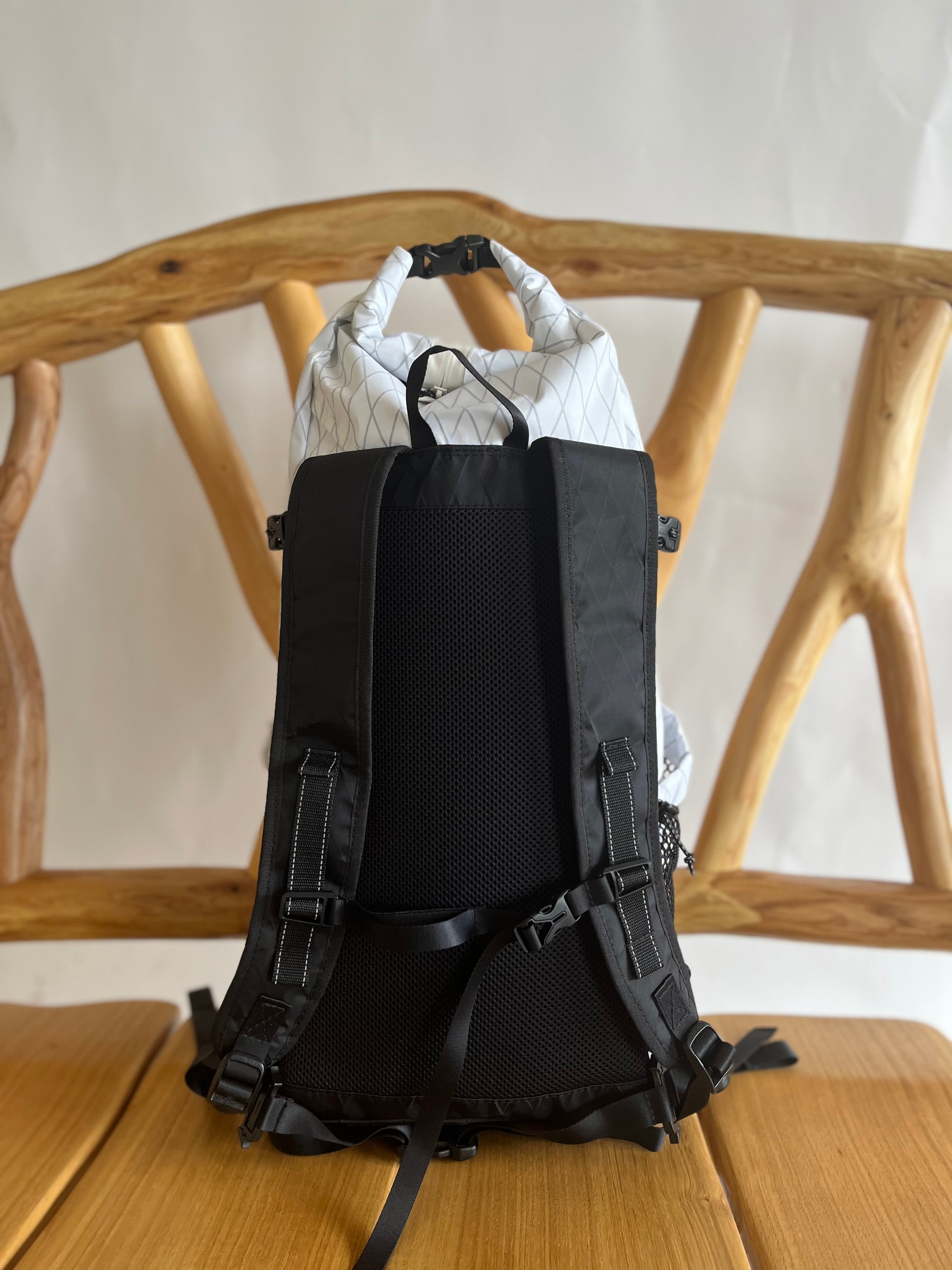 X-pacを使用したロールトップ型バックパックです。容量に合わせてバックパックの大きさを調整できるロールトップ式を採用いたしました。また素材にX-pacという防水で丈夫な生地を使用しております。